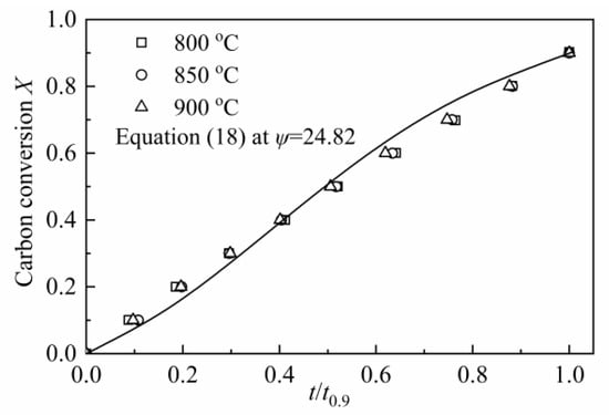 According to Equation (19), the value of ψ was calculated as 24.82, which was shown in Figure 8. Compared with the value of ψ (varied from 2 to 12) for CSC in MRPM, it is larger. A high value of ψ indicates a high porosity of the char sample, and more reactions will occur at the internal pores of the char [60]. Other researchers also obtained a high value of ψ by using RPM to describe biomass char gasification, i.e., Wang et al. [23] found the value of ψ for maize cob char, wheat straw char and pine sawdust was 128.24, 88.54 and 149.37, respectively; Lin et al. [6] observed a value of ψ of 15 and 450 for Wood 800-5 and Miscanthus 800-15, respectively.