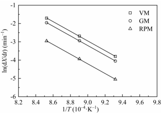 Figure 9 is the Arrhenius plots of H2O-CSC by using reaction constants calculated from VM, GM and RPM. The values of Ea and A obtained by adopting different models are listed in Table 9. Compared with Table 5 or Table 7, the value of Ea for H2O-CSC is higher than CSC, which can be attributed to the loss of catalytic effect of AAEMs after water-leaching process.