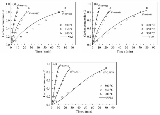 In order to validate each model, the experimental data was compared with the calculated values at different temperatures, which was shown in Figure 10. In accordance with Figure 10, the better the linear relation in Figure 7, the higher goodness of fit between the experimental and model calculation results in Figure 10 will be. In conclusion, MRPM is no longer appropriate for predicting the gasification behaviors of H2O-CSC; instead, RPM gives a better fitting result for H2O-CSC, followed by GM and VM. It can be considered that the loss of AAEM (especially K in this paper) by water leaching leads to the decrease in reaction rate and an obvious change of the shape of dX/dt-X, thus making MRPM inappropriate to evaluate the gasification behaviors of H2O-CSC. However, a deep understanding about the influence of AAEMs on biomass char gasification modeling needs to be explored in future work.