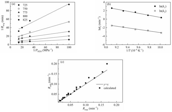 Relationship between (a) 1/Ravg and 1/PH2O and (b) ln(ki) and 1/T for CSC; (c) comparison of the experimental results with calculated values of the L-H model.