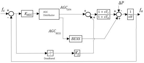 The AGC regulates the minute-to-minute frequency deviations. The model used is based on [24], consisting of a proportional gain . From [24], it is assumed that the reserves and ramp capacity of the system are sufficient to follow the AGC signal. The above constraints are introduced to the model as explained in [25]. The control diagram is presented in Figure 1.