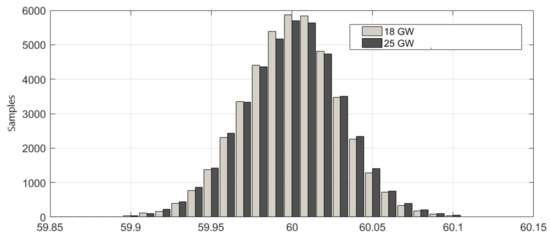 The simulation considered a BESS with a capacity of 100 MW () in total. The efficiency of the BESS is set to 90%. This way, the maximum energy capacity is varied to verify dynamic compliance (). Then, a base case scenario is simulated to see the behavior of the system, including the BESS with a variable capacity for each wind penetration scenario. The histogram of simulated frequency is shown in Figure 3.