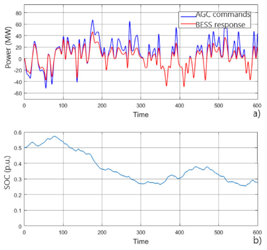 In order to observe the time behavior of the simulated cases, 10-h time responses are considered. Figure 5a shows the BESS power response with respect to the AGC command signal, and Figure 5b the SOC state.