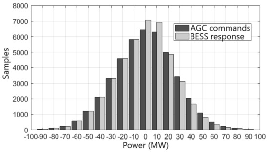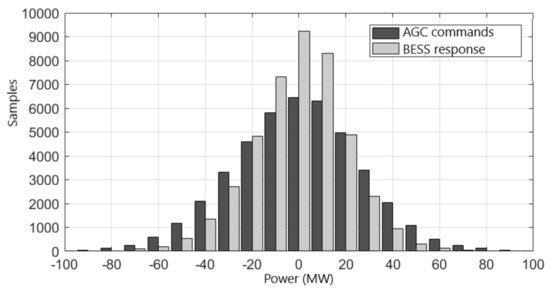 In order to observe the effect of the aging-preventive algorithm in the entire period under analysis, a 1-month histogram of AGC commands and the BESS response is shown in Figure 6.