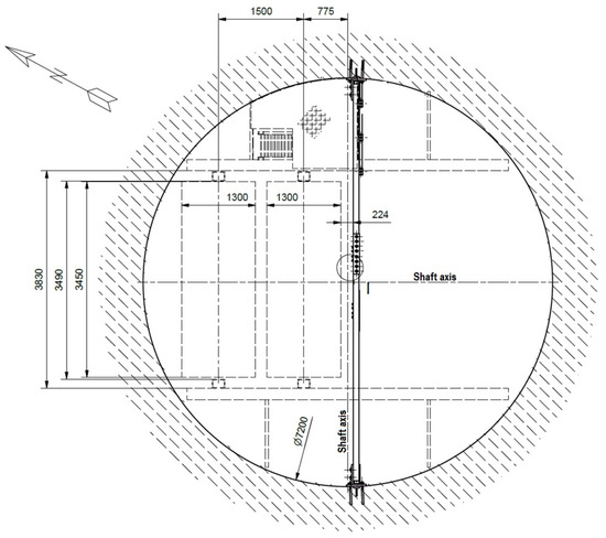 As it was presented in Table 1, shaft no. 1 of the Szczygłowice department in the Knurów-Szczygłowice coal mine is a downcast shaft comprising of two sections (southern and northern) with a diameter of 7.2 m and depth of 873.80 m and concrete shaft lining. The shaft is equipped with two hoists—one on the northern side, operating to the level 850 m—and another on the southern side with the hauling depth of 450 m. Each of the hoists is equipped with two four-compartment cages. A cross-section of the shaft is presented in Figure 1.