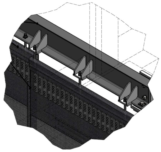 The actual brattice wall construction is made of Grid Carbo type polyester fiber composite net of 15 × 15 mm mesh size. The length of a single net sheet is about 30 m. It is to be extended between the top and bottom buntons. The total width of the brattice wall is about 7.1 m, however, it is split into three sections of width consecutively 3755, 1765, and 1738 mm. Technological gaps for buntons and other elements of the shaft equipment are to be made in the net. Tensioning beams are to be assembled on both vertical ends of the net using steel locking sheets. Vertical sheets of the net section are to be end-to-end jointed with steel sheets. They are also to be assembled into a ladder compartment using tensioning belts with attachments. A view of the tensioning belt and the attachment is presented in Figure 2.