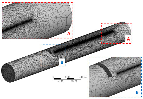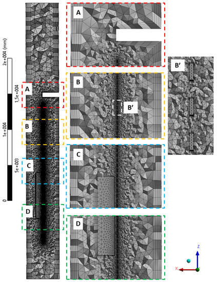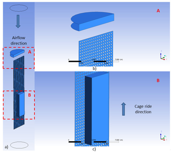 The research was divided into two stages. The first of them consists of Computational Fluid Dynamics (CFD) analysis comprising forced airflow of speed about 6–8 m/s and movement of the conveyance with a speed of 10 m/s, which was selected as the most adverse case of the airflow. The assumed speed of the conveyance is in fact its maximum speed in the shaft. The model is characterized with huge dimensional disproportion, as the maximum dimension is the length of the shaft section, which is equal to 60 m (60,000 mm), while minimum dimensions are the net thickness, which is 3 mm and mesh sizing of 15 × 15 mm, so the ratio of extreme dimensions is about 20,000. Taking into account the need for the discretization of the model with a huge disproportion of dimensions together with the requirement for generating so-called boundary layers (inflationary layers) for purpose of determination of air particles flow and influence of the local pressure, a fully realistic model is impossible to discretize. Therefore the net was scaled to the smallest possible dimensions. After 13 times scaling, 40 mm thick net of 200 × 200 mm mesh sizing was obtained, which allowed to discretize the whole model. Modelled airflow between two sections divided with the brattice wall is similar to the real one. Discretized model is presented in Figure 5 and Figure 6. Discretization allowed one to obtain over 12 million finite elements and about 3.5 million nodes.