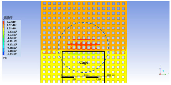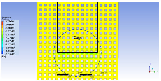 The air domain model was determined in 50 iterations to obtain good results relevance. After the iterations values of the analyzed quantity were stable. Moreover, quality parameters, as skewness and orthogonal quality, were checked. Disturbances of the airflow caused by the artificial shaft bottom are visible in Figure 7, as well as local increases of airflow velocity. The simulation revealed that during the movement of the surface of the upper transom of the cage through the vicinity of the middle section of the brattice, the net is pushed away by overpressure caused by airflow. Despite the consideration of the moving conveyance case, the simulation was a static analysis, comprising the time and position of the cage.