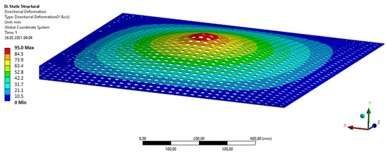 The second stage of simulation comprises strength analysis, identified areas and values of pressure were mapped and interpolated on the net model in strength analysis. The aim of the strength analysis was the determination of the brattice wall deformation induced by the moving cage. As the net is loaded only by its own weight and preloading, determination of stress state was not necessary. Displacement analysis required accurate parameters of the net’s material. Laboratory tests with a testing machine allowed one to estimate the value of Young’s modulus of the net’s material. In turn, it allowed one to conduct strength numerical analysis, reflecting the laboratory experiment using a square fragment of the net with dimensions of 1 × 1 m (Figure 11).