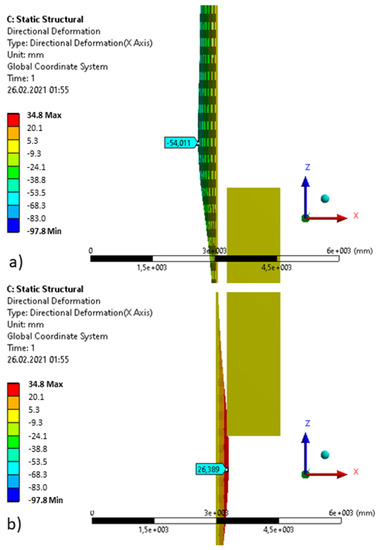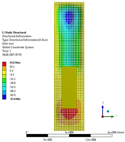 Results of the experiment confirmed the assumptions and forecasts of the brattice’s behavior. As it was stated before, the determination of the stress state of the brattice wall was not analyzed. The subject of the analysis was the net deformations, as no stiff construction was designed to install it in the shaft. As it can be seen in Figure 12 and Figure 13, the brattice is pushed away from the cage in the area of overpressure occurrence, which is a desirable effect, as the greater distance between the cage and the brattice increases safety level. On the other hand, in the area of the underpressure occurrence, the brattice is pulled towards the cage. However, it is not considered a problem, as it happens below the cage after it leaves this area. The presented case was selected as the most unfavorable one.