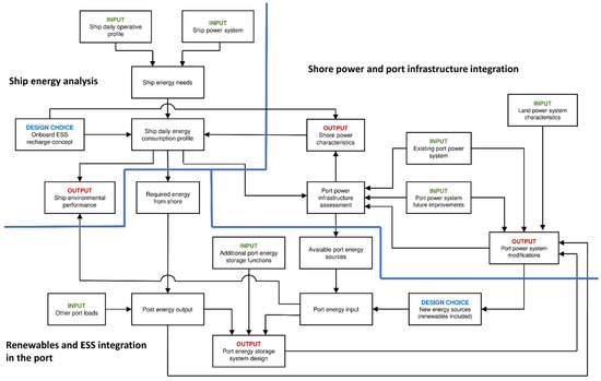 Proposed methodology for the integration of environment-friendly ships, shore connection apparatus, energy storage system, and port electrical infrastructure, including the subdivision in sub-processes (blue lines), whose denomination (bold black text) refers to the title of the paper sections in which their application to the case study is described.