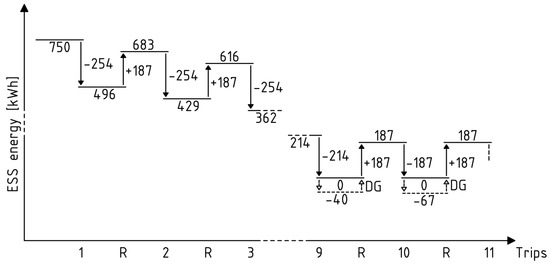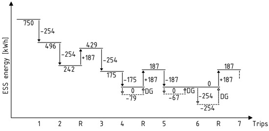 A better accuracy in ship energy flows determination can be achieved by representing the sequence of charge and discharge operations on a graph, as shown in Figure 4. In the figure the trips are identified by an increasing number, and the recharge operation through the MV-SC by a capital R. As can be seen in the figure, the DG is required already during the fourth trip, to provide the missing 79 kWh. Then, from the fifth trip onwards the contribution of the ESS to the ship operation is reduced, as it can only provide 187 kWh in respect to the 508 kWh consumed by the ship between two recharges. Still, the ESS provides a nearly 37% contribution to the energy required for a complete round route (two trips).