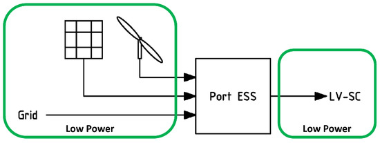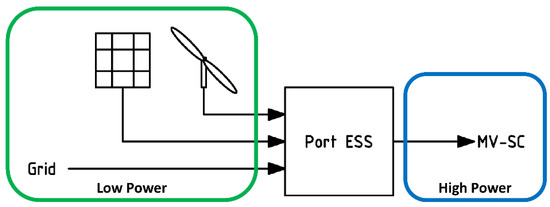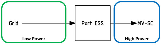 For a ship that can obtain a part of its energy from the port, the environmental performance (bullet 1) depends not only on its energy consumption profile, but also on the port energy input carbon intensity. The ship’s environmental-friendliness can be evaluated with different indexes, such as total fuel consumed, total emissions, and so on. The choice of the specific indexes and the evaluation method is upon the designer, as it directly depends on the specific route and port’s location (different rules and regulations can apply in this regard). It is relevant to notice that in most applications it will be required to consider multiple indexes, but the definition of the best weighting factors for producing a ranking among different solution is still an open research point. The shore power interface characteristic (bullet 2) is both one of the outputs of the process and an input for defining the ship daily energy consumption profile. The latter is again required to achieve the output item through the Figure 1 process. In such a case, a first guess has to be made for the set of data required to close the loop, and then the process has to be run iteratively until a feasible solution is found. In this case, the shore power characteristics that is required for the definition of the following item is the SC power, which in turn depends on the onboard ESS recharge concept. Thus, a power level needs to be set during the first process iteration, and then it has to be corrected (if needed) following the loop feedback. Besides the power, other SC characteristics must be defined during the process to provide a complete shore power interface design, such as voltage, ambient conditions, plugs type and size, specific applicable rules and regulations, and so on. Among the methodology outputs, there are also the changes that have to be made to the existing port power system to enable the SC installation, the port ESS integration, and so on (i.e., all the infrastructure required to enable the green ship use). These are referred to in bullet 3 of the above list, and can include new substation installation, modification of existing power equipment, replacement of power cables, and so on. The last output of the process is a port ESS design suitable for supporting the ship recharge and all the other port needs (bullet 4). This output can be a simple estimation of power, energy, and technology requirements (to be given to a third part for design, construction and supply), or can be a more detailed design, depending on the specific application.