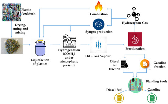 The Polish company Handerek Technologies, in cooperation with Łukasiewicz-Automotive Industry Institute, has developed a new technology (HT technology) for the conversion of waste plastics to hydrocarbon fractions with relatively short chains. The technology enables thermolysis and hydrogenation processes to be carried out under atmospheric pressure by using reactive distillation in a synthesis gas (H2 + CO) atmosphere as a carrier gas [32]. Performing liquefaction without catalysts and obtaining hydrocarbons with chain lengths from C4 to C22 and boiling points below 360 °C, without the need to separate and return to the process long chain alkanes, reduces process costs. In addition, avoiding increased pressure significantly reduces plant construction costs. The operational expenses can be further reduced by using non-condensable light hydrocarbon fractions for reactor heating or synthesis gas generation. The process diagram from raw material to fuel products is shown in Figure 1. It should be mentioned that, for example, thermolysis using the technology described above generates from 6 kg of waste plastics ca: 5 kg (6.3 dm3) of liquid product, 0.1 kg of solid phase (carbonizate) and 0.9 kg of gases of high-energy value.
