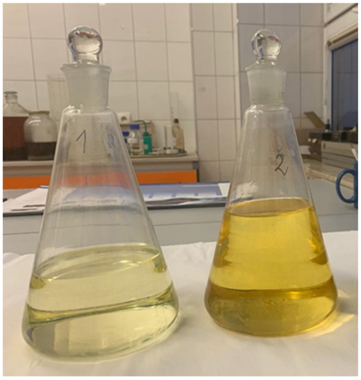 Consideration of the selection of a waste plastic that could be a source of octane-raising compounds led to polystyrene. The styrene obtained from its thermolysis is a compound that could increase the aromatic hydrocarbon content in the liquid product and thus increase the octane number. The boiling point of this compound is 145 °C, which in the result of distillation means it would remain in the petrol fraction. Therefore, in order to improve properties of the petrol fraction, an experiment was performed in which 10% of waste PP was replaced by PS. The mixture prepared as described above was thermolyzed and hydrogenated under similar process conditions as for PE/PP mixture. The obtained liquid product was distilled into petrol fractions (boiling to 190 °C) and diesel fractions (boiling above 190 °C); the appearance of both fractions is presented in Figure 2.