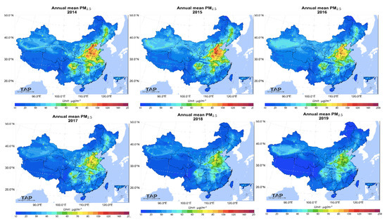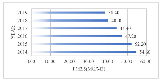 Figure 2. The annual average concentration of PM25 emissions from 2014 to 2019 in China. (http://tapdata.org.cn. accessed on 15 August 2021).