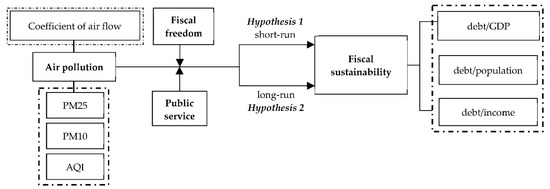 Figure 4. The impact mechanism of air pollution on fiscal sustainability. Notes: Figure 4 presents an overall framework for the following empirical analysis. First, we analyze the impact of air pollution on fiscal sustainability (debt/GDP) in the short and long run, and then analyze the role of fiscal freedom and public service capability on the relationship between air pollution and fiscal sustainability. Finally, we conduct the robustness tests by instrumental variable estimation (coefficient of air flow), substituting the air pollution indicator (PM10, AQI), and substituting fiscal sustainability indicators (debt/population, debt/income).