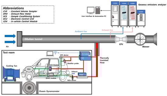 Figure 2 presents a schematic of the chassis dynamometer in the laboratory and illustrates an example for the correlation test of the PEMS, SEMS, and CVS equipment. Furthermore, the specifications of the chassis dynamometer and exhaust emissions analyzer are summarized in Table 1 and Table 2.