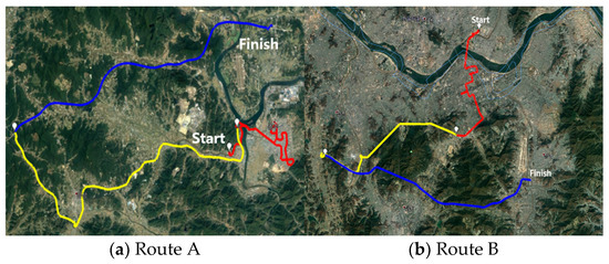 In this study, the RDE tests were performed along Route A and Route B developed by satisfying the above conditions. As illustrated in Figure 3a, Route A reflects driving patterns such as low vehicle traffic in urban areas of small and medium cities in Republic of Korea, and this route has a total distance of 93.3 km, including urban, rural, motorway parts. As illustrated in Figure 3b, Route B reflects the representative traffic density and comprises a highly populated metropolitan area (Seoul) in Republic of Korea. In addition, it is a route with a total distance of 70.5 km, including urban, rural, motorway parts. The major difference between Routes A and B is the vehicle speed according to the traffic jam in the urban part.