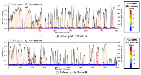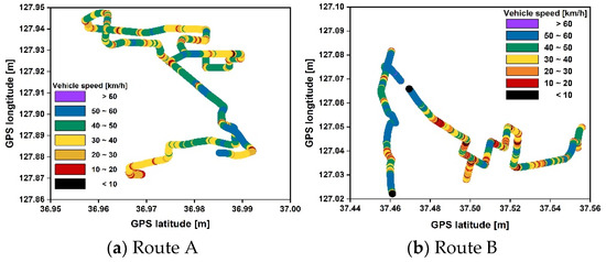 As presented in Figure 4, it can be observed that Route B has more areas with vehicle speeds below 30 km/h than Route A. In areas where the vehicle speed is low, vehicle congestion is frequent; accordingly, this vehicle congestion triggers an increasing stop ratio in the urban part. Based on the RDE test, it can be confirmed, as shown in Table 5, that the stop ratio in the urban part of Route B was 36.39%, which is approximately 12% higher than that of Route A.