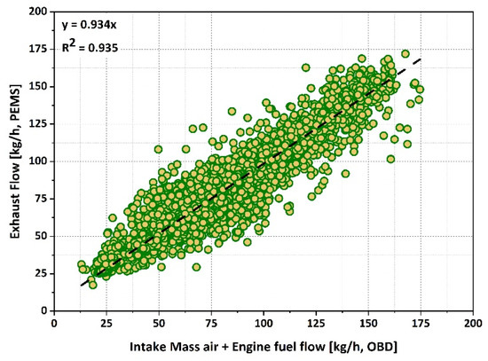 Unlike the PEMS equipment, the SEMS equipment does not have an exhaust flow meter. Hence, mass air flow and total injection quantity from the OBD data of the test vehicle are introduced to calculate the exhaust flow rate. The calculated exhaust flow rate is used to convert the NOx measured in concentration units (ppm) into mass units (g/s), as expressed in the following Equation (2) [4]. To verify the reliability of the SEMS equipment data, the exhaust flow rate measured by the exhaust flow meter of the PEMS equipment, and the exhaust flow rate calculated by introducing mass air flow and total injection quantity of the aforementioned OBD data are compared and presented in Figure 7.