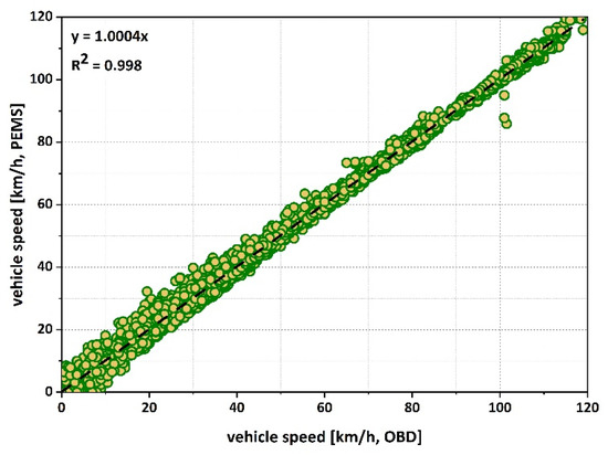 In addition, the vehicle speed measured by GPS signal of the PEMS equipment and the vehicle speed measured by OBD data of the SEMS equipment are compared and presented in Figure 8. The comparison results indicated that the slope of the exhaust flow rate between the two types of equipment was 0.93, and the slope of the vehicle speed was significantly close to 1. Accordingly, it was possible to verify the reliability of the OBD data measured by the SEMS equipment.