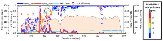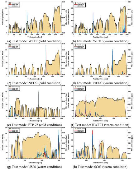 Figure 11 presents the time continuous NOx emissions measured by the PEMS and SEMS equipment under each test mode. It can be seen that profiles of NOx emissions measured by the PEMS and SEMS equipment follow similarly under all the test modes.