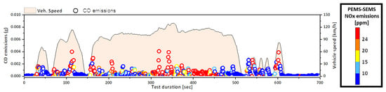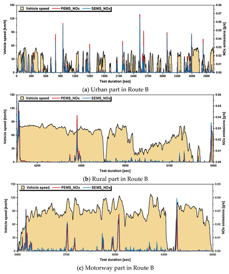Figure 18 and Figure 19 illustrate real-time NOx emissions measured by PEMS and SEMS equipment for each driving part in Routes A and B, respectively. It can be observed that the NOx emissions measured by the PEMS and SEMS equipment under the RDE tests are similar. Unlike the results of the various test modes on a chassis dynamometer in the laboratory, NOx emissions measured by the SEMS equipment were higher than those measured by the PEMS equipment because the RDE tests consider various driving variables. As mentioned above, excess NH3 emissions from the SCR system, which adopts NH3 as a reductant to reduce nitrogen oxides, were injected, such that it was determined that the NOx emissions were measured by the NOx sensor.