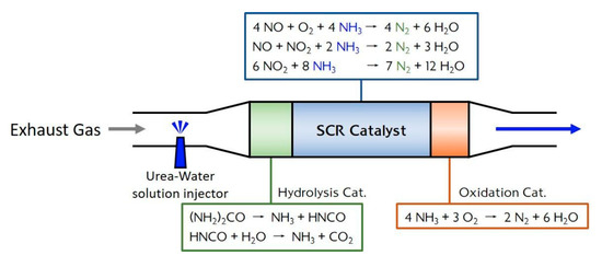 Urea solution is supplied before the SCR system, and is hydrolyzed to NH3 via two steps of the following Equations (9) and (10) by the intermediate product isocyanic acid under an exhaust temperature above 250 °C [26].