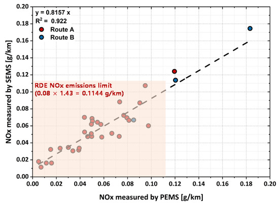 In Figure 16, the red circles indicate NOx emissions measured by PEMS and SEMS equipment on Route A, and the blue circles indicate NOx emissions measured by PEMS and SEMS equipment on Route B. Based on the comparison of NOx emissions measured by PEMS and SEMS equipment under RDE tests, the slope of the RDE test was 0.816, which is lower than the slope of the laboratory test. The slope of the RDE test was lower than that of the chassis dynamometer because the test was considered owing to the various on-road driving variables, such as a traffic jam in the urban part, driving style according to the driver, and road grade of route. These various on-road driving variables affect the engine load of vehicle. As the engine load of the vehicle increases, NOx emissions increase, and the tolerance of NOx emissions measured by the two types of equipment increases [28]. For this reason, the slope of the on-road is lower than that of the chassis dynamometer. In addition, the coefficient of determination was 0.922, thus indicating that the results were very similar. Most of the test results were within the RDE NOx emissions limit (0.1144 g/km).