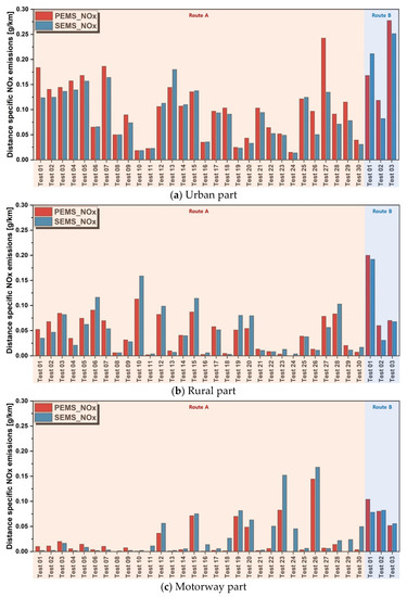 As presented in Figure 17, NOx emissions measured by PEMS and SEMS equipment on Routes A and B were quantitatively indicated for urban, rural, and motorway parts. Regarding the urban part, it was determined that NOx emissions were higher than that of other driving parts because there were various driving characteristics such as vehicle congestion owing to the shutdown of the signal system, and a highly populated metropolitan area. Regarding the rural and motorway, it was determined that NOx emissions were lower than that of the urban part because of inertia driving with a fuel-cut, which can improve the fuel efficiency of the vehicle, and reduced exhaust emissions becomes possible as vehicle speed increases [29]. In addition, NOx emissions measured by the SEMS equipment were relatively higher than that of the PEMS equipment. As this is an amperometric method, it is based on the principle of the NOx sensor in the SEMS equipment. The amperometric method generates nitrogen and oxygen by splitting NOx (NO and NO2), as defined in the following equations. At this point, the generated O2 molecules are measured as the NOx inside the sensor.
