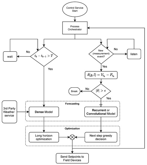 The full-automatic control process is implemented as a web-service application that, once started, activates different routines, mainly Forecasting and Optimization Modules, alongside required connectors for devices and external services. The variables and represent current clock time and last activation time, respectively. At predefined interval T, e.g., half an hour, the process of long-horizon forecast (e.g., 48 h), and in turn, relevant optimization model, gets activated, and set-points are being sent for the next H hours. Due to the presence of noises (load and noncontrollable generation), a decoupled thread is placed to listening to the quasireal-time measurements from the field devices. If the difference between measurements and predicted values does not exceed certain defined error threshold , the latest instructed set-points will be respected, otherwise a fast control chain (including a Recurrent forecast model and the consequent greedy optimization) quickly responds and overwrites the next(s) step’s set-point. Predictions and optimization models are described in detail in Section 4 and Section 5 respectively.