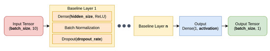 The Neural Network architecture presented in Figure 3 is denominated Baseline because it generates the long-term forecasting which characterizes the first baseline for the approach. Indeed, it is used in the system to infer a single float value for sun irradiation for every hour in the 48-h weather forecasting provided by OpenWeatherMap in real-time. The Baseline Layer is the core part of the architecture and it is composed of a regular densely connected neural network layer with a specific hidden size and activation function, a layer for batch normalization and a dropout [37] one. To find the most appropriate architecture to use for this specific problem, an explorative grid-search was carried out to discover the best set of parameters capable of minimizing the loss in the test set (Mean Squared Error in this case) by using Adam [38] as an optimizer. The activation function selected for the training was the Rectified Linear Unit (ReLU). The hyperparameter tuning was set on the following factors: