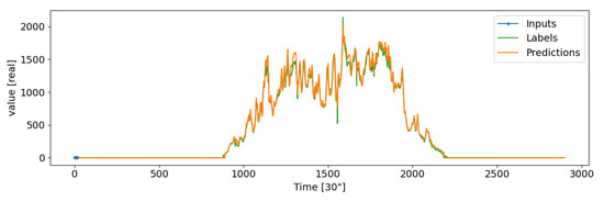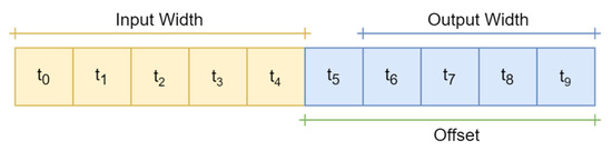 Even if the structure of these three kinds of networks is fundamentally different, all training of these architectures was carried out by windowing the stream of real data of solar irradiation coming from the field with a granularity of 30 s. Setting aside input and output label width, a data window like the one shown in Figure 6 can be defined by a triplet of features: the input width (I), the output width (O) and the offset (F).