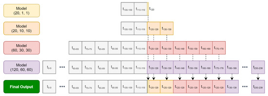 For this reason, even if the training of all networks was carried out independently, the outputs from each neural network are stacked on top of each other and precedence is given to values that come from a neural network with a smaller output size, which will override the output data coming from the neural networks with a larger but less accurate view. Figure 7 shows a graphical overview of the approach.