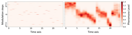 Pheromone matrix (left). Pheromone matrix applied cross-correlation (right).