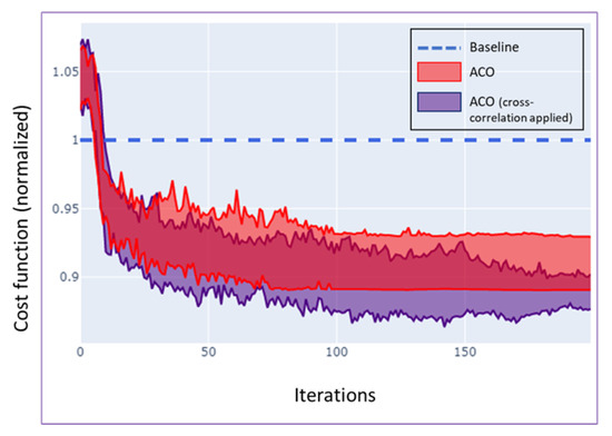 As a result of applying cross-correlation to the pheromone matrix, exploration outcomes spread to neighbor’s path, even with limited artificial ants and big search space, as can be perceived from Figure 14. In some cases, this will benefit the objective function as can be seen in Figure 15.