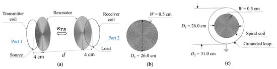 This paper discusses the variations of an MRC-WPT system using different resonators. As shown in Figure 1a, in this study we adopted a four-coil MRC-WPT system. The transmitter and receiver are composed of a single-loop coil and a resonator. The distance between the single-loop coil and resonator was set to 4 cm, where the quality factor of the two resonators is most equal. Two types of resonators were considered: a conventional resonator and our proposed resonator structure. The conventional resonator consisted of a spiral coil, as shown in Figure 1b (referred to here as a non-grounded resonator). As shown in Figure 1c, the proposed resonator aims to reduce the coupling between the WPT system and the human body, using a grounded single-loop coil around the spiral coil. The spiral coil and grounded loop were coaxially located on the same plane. This resonator is hereafter referred to as a “grounded resonator” for simplicity. The receiver structure of the MRC-WPT system was identical to that of the transmitter [40]. The geometric parameters of the spiral resonator were determined using its self-resonant frequency and quality factor [41]. In Figure 1a, κTR represents the coupling coefficient between the transmitter (denoted as T) and receiver (denoted as R). Resistance is connected to the receiving coil, imitating the load. All coils used in this study were made of 1-mm-diameter copper wire. Copper wire is widely used in laboratory and industrial applications for WPT systems in different thicknesses/diameters. [42] showed that 1 mm-diameter copper wire has more transmission efficiency than other diameters. Therefore, this study adopted the 1-mm-diameter copper wire. The working frequency was set to 13.56 MHz since this is a promising frequency for WPT applications in industrial, scientific, and medical fields [16,34,43].