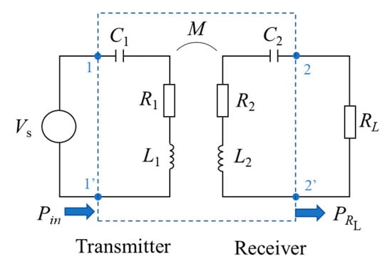 In this study, the voltage source is applied without considering impedance matching [46]. Therefore, the transmission efficiency η of the entire WPT system (blue dashed box in Figure 2) can be calculated as the ratio between the actual input power at port 1–1′, i.e., Pin, and actual output power PRL, which is expressed as follows: