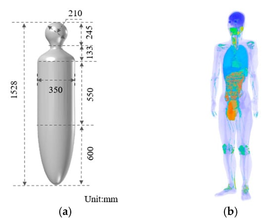 The human-body models adopted in this study are shown in Figure 3. As shown in Figure 3a, a homogeneous axial-symmetric human model was adopted from the IEC62233 standard [47] to evaluate the mutual interaction between the MRC-WPT system and a human body in the vicinity. Its height and maximum diameters were 1.528 and 0.35 m, respectively, which approximated the size of an adult human body. In addition, the dielectric properties of the homogeneous model were set to two-thirds of those of a muscle, an approach which is often used to represent the average electrical properties of a human body [14].