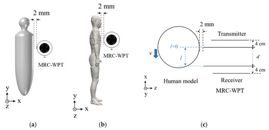 In some cases, the most restrictive factor for human safety has been reported to be electromagnetic safety, rather than electromagnetic interference with neighboring electric or electronic devices [18,19]. This issue can also be important in MRC-WPT, especially concerning the frequency-splitting phenomenon due to the presence of multiple coils [20]. In addition, considering the human interaction with the system, the human body is a poor conductor at low frequencies [21]. Thus, the electric field vectors at the body surface must be normal to the body surface. Therefore, the electric field induced in the human body by an external electric field occurs due to the electric charge that accumulates at the model’s surface [22].