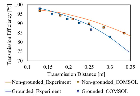 We compared the calculated transmission efficiency with our experimental results [40] to validate our computational model. The experiment result was expressed as (%) [55], and the COMSOL results were evaluated using Equation (3). In the experimental study, the resonant frequency of the WPT system was set to 10 MHz. Therefore, the operating frequency of the computational model was adjusted to 10 MHz. This may not violate the generality principle as the frequency and coil length are inversely proportional to each other. Figure 5 shows the differences between the computation and measurement results. The transmission efficiency was within approximately 5% of the difference (the change was most significant when using ungrounded resonators with a transmission distance of 0.21 m), which validated the computational methods used in the current study.