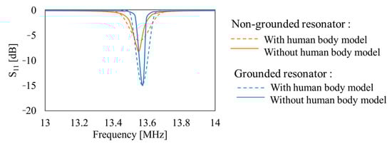 The S11 values of the two WPTs with and without a human model at their resonant frequencies are listed in Table 1. The resonant frequency was set to 13.56 ± 0.01 MHz. The S11 values of the WPT with a non-grounded resonator varied from −8.16 to −6.06 dB when the human model was considered. Meanwhile, the S11 values of the WPT with a grounded resonator varied from −14.97 to −14.1 dB. This result implied that the grounded resonator suppressed the interaction of the human model with the WPT performance. As a result, the bandwidths of the curves in Figure 6 became wider, indicating reduced quality factors with human models.