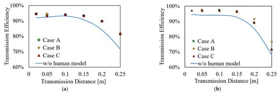 Figure 7 shows the transmission efficiencies at different transmission distances d. The solid curves in Figure 7 show that the transmission efficiency gradually decreased with increasing the transmission distance d because of the decreasing coupling coefficient between the transmitter and receiver [56]. In addition, the transmission efficiency of the MRC-WPT system with a grounded resonator exhibited slightly better performance than the non-grounded resonator at d < 23 cm. Next, we considered the effects of the presence of a human body on the transmission efficiencies of the two types of MRC-WPT systems at different body locations with the increase in the transmission distance. The markers in Figure 7 showed small increases in the transmission efficiencies when the human body was close to both systems. For example, at d < 10 cm, the variations in transmission efficiencies were marginal for the two systems. However, the influence of the human body reduced the transmission efficiency by up to 10 percentage points at a maximum distance of 25 cm. Altogether, the variation in transmission efficiency is marginal at different body locations (i.e., cases A, B, and C), mainly due to the size of the human body being larger than the transmission distance.