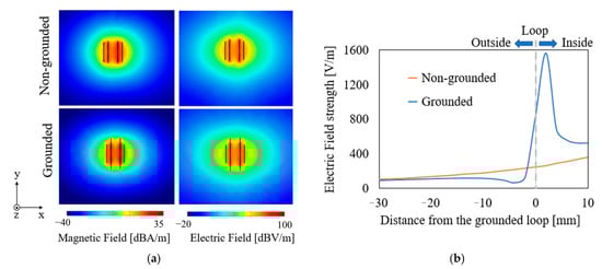 The electric field distributions of the two MRC-WPT systems were also calculated. Figure 8a shows that the grounded loop concentrated the electromagnetic fields around the MRC-WPT systems. A section of the gray data line in Figure 8a is shown in Figure 8b to illustrate the electric field’s strength inside and outside the grounded loop. The origin of the coordinates in Figure 8b was set to a point in the grounded loop. In addition, Figure 8b confirmed that the electric field outside the grounded loop was reduced compared with that in the WPT system with a non-grounded resonator. The electric field distribution results were also consistent with those derived from S11 [14].