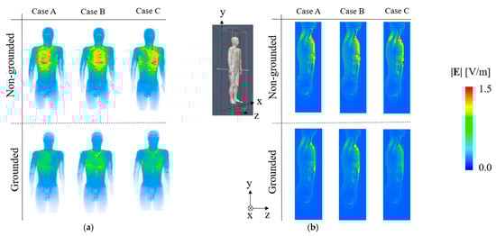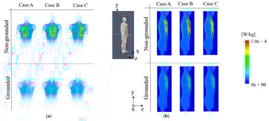 An in-house-developed SPFD solver was used to calculate the induced electric field and local SAR in the TARO model using 1-W transmission power for the two types of resonators at 13.56 MHz, where the distance between the transmitter and receiver, denoted as d, was 9 cm (the distance at maximum system efficiency). The locations of MRC-WPT relative to TARO are shown in Figure 4b,c. Figure 9 and Figure 10 show the induced electric field and local SAR distributions, respectively. In all cases, hotspots appeared around the chest in the TARO model, the closest body part to WPT. Reductions in the induced electric field and SAR in TARO were observed in the WPT with a grounded resonator. The simulation results shown in Figure 9 and Figure 10 indicate that the induced electric field and SAR in the human body were reduced in the MRC-WPT system with a grounded resonator. This was mainly caused by the grounded loop that suppressed the leakage of the electromagnetic field around the MRC-WPT system, resulting in interaction with the human-body model.