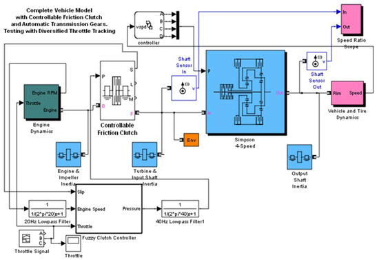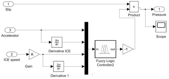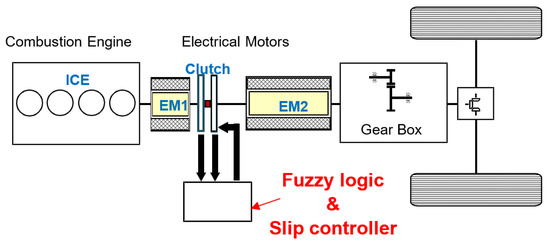 In this study, we use the vehicle dynamic formulas and clutch calculations from the textbook [34]. Real vehicle parameters are used in the updated 2021 Hyundai Sonata HEV. The fuzzy logic and slip controller are installed in the HEV clutch as shown in Figure 2.