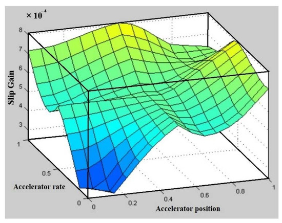 The full fuzzy logic controller on MATLAB Simulink R2021b is designed and shown in Figure 8. This controller receives and processes data in real-time from the accelerator position; accelerator rate; ICE speed; and ICE speed rate with the above fuzzy logic laws and generates the slipping gain values. The clutch normal force is now a product of slipping ratio from the angular slipping velocity sensors in the two clutch plates and the slipping gain values calculated from this fuzzy logic controller. The clutch engagement and vibration are now controlled by this normal control force.
