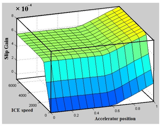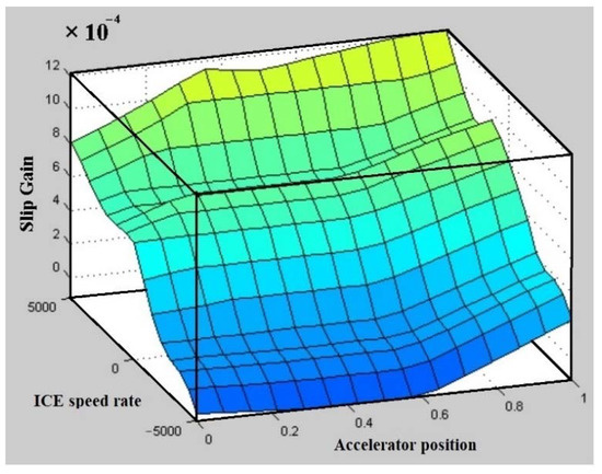 The followings are our fuzzy logic laws according to the position of the accelerator pedal: None (less than 1%), Little (1–20%), Medium (20–80%) and Large (more than 80%). And the accelerator rate: Slow (less than 20%/s), Medium (20–80%/s), and High (more than 80%/s). Similarly, the variable for the ICE speed is: Low or idling speed (less than 750 rpm), Upper (750–1830 rpm), Medium (1830–3540 rpm), and High (faster than 3540 rpm), and the variable for the ICE speed rate is: Falling Quickly (less than −2500 rpm/s), Falling Gently (from −2500–0 rpm/s), Constant (0 rpm/s), Rising Gently (0–2500 rpm/s), and Rising Quickly (greater than 2500 rpm/s).