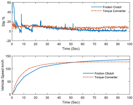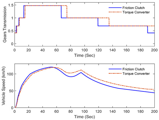 Figure 10 shows that the vehicle reaches the speed of 130 km/h in 50 s, the friction clutch system leads to automatic gear switching faster than the hydraulic torque converter and, hence, the vehicle reaches the maximum speed faster than the torque converter. With the sharp and full release of the accelerator pedal, the vehicle speed also reduces faster than the torque converter because of faster disengagement of the friction clutch than the torque converter.